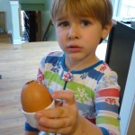 Using an icepick or other sharp pointy object, make a hole in the top of each egg shell. Carefully! Then enlarge the hole to about a 1/2 inch in diameter by carefully removing little bits of shell.