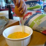 Pour out the insides and reserve for your cake batter, and/or other uses. (If you need to separate eggs for your cake batter, like I did, just pour out the whites first into one bowl, then use a toothpick to break up the yolk, and pour it into a separate bowl. Otherwise, just use a toothpick to mix the egg up a bit in the shell, then pour out.