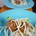 So… I decided to make a FSM (Flying Spaghetti Monster) out of a radical combination: Spaghetti and meatballs. No, these aren’t just stacks of spaghetti, with meatballs on top, these are true meatball creatures… suitable for your own Flying Spaghetti Monster, or whatever you’d like to create!