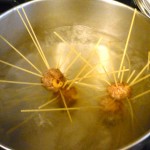 - Continue stabbing your 2 meatballs with 1/2 to 1/3 length dry spaghetti noodles (see pic). Leave some open areas for the meatballs to show.