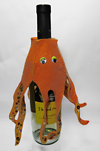 My friends Dennis and Grieg (Grieg is a very talented photographer) are apparently also a very talented crafty dudes! Love this little cephalopod wine bottle cover… isn’t he just too cute!? Even though cephalopod week is officially over, I had to do just one more to share this.